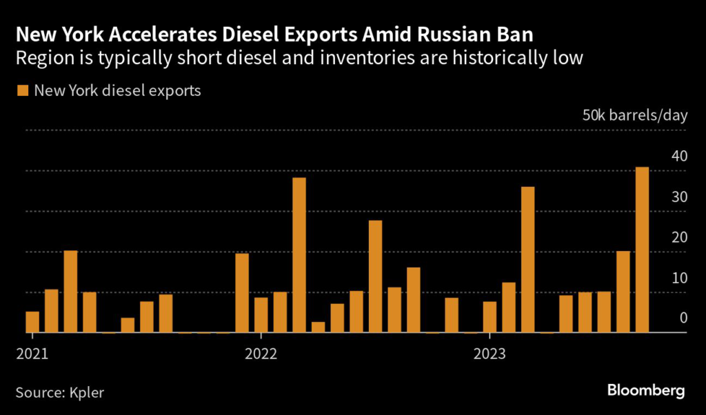 (Bloomberg) — New York is rising to the fore as an unlikely diesel supplier, shipping out three cargoes in one week as Russia’s fuel export ban sends buyers searching for new supplies.