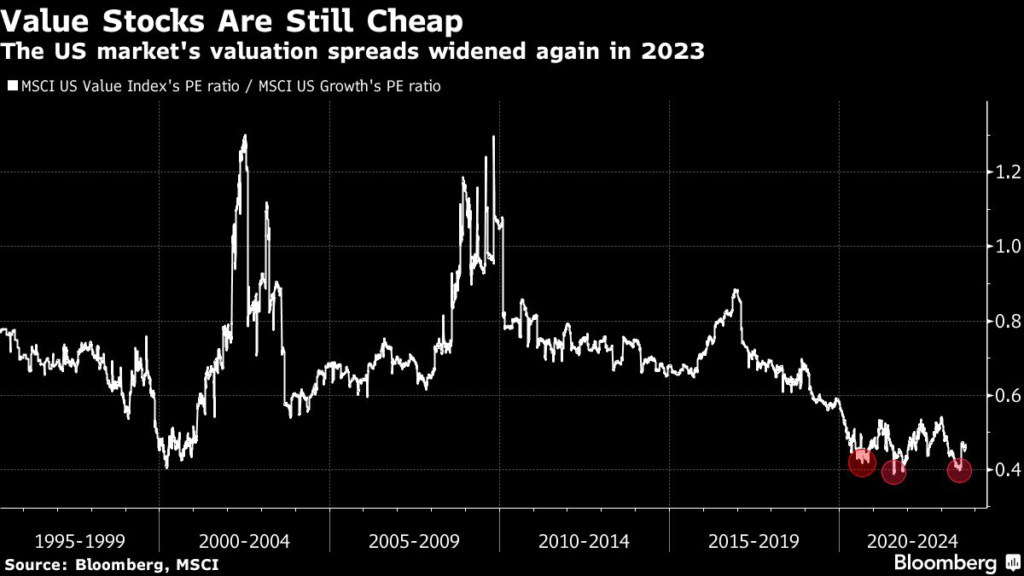 Arnott, whose firm runs about $130 billion, points to the market’s valuation spreads, which widened anew this year as expectations for lower inflation and optimism about artificial intelligence lifted the multiples of beloved tech stocks.