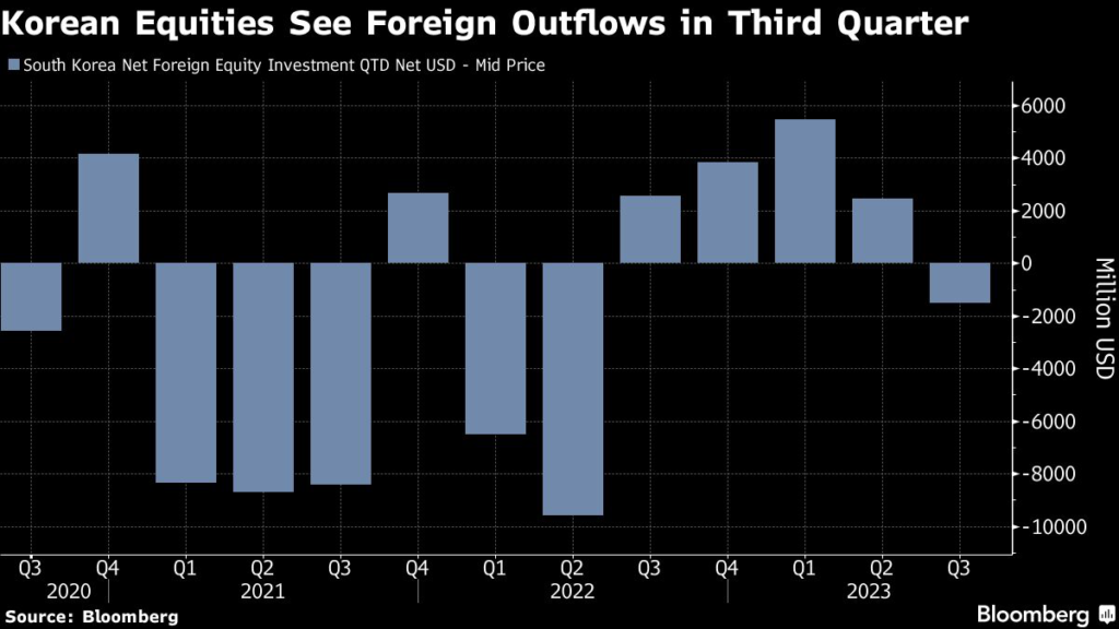(Bloomberg) — South Korean equities are on track for their first quarterly outflow of foreign funds in over a year as investors cash out of electric vehicle suppliers following big gains.