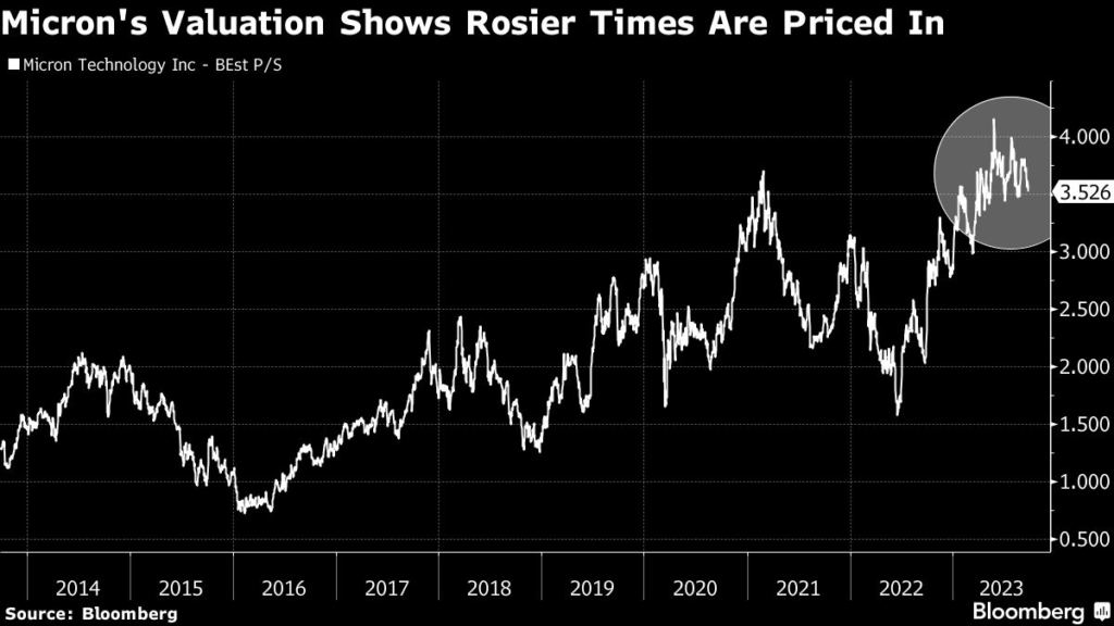 Only two of the 38 analysts who cover the company have a sell recommendation, with the vast majority recommending buying its stock, according to data compiled by Bloomberg. Micron shares are priced at 3.5 times sales projected over the next 12 months, compared with an average of 2 times over the past decade.