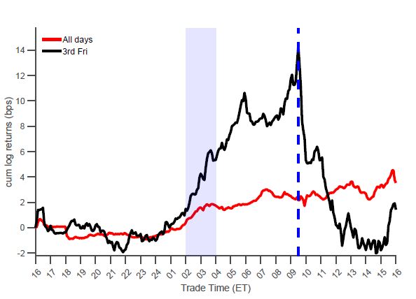 It turns out the market has a propensity to rise during the night before Friday’s settlement and then pull back just after — a pattern the authors assert could be deliberately manufactured.