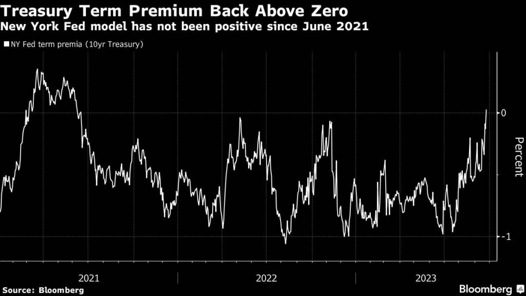 (Bloomberg) — A key measure of how much bond investors are compensated for holding long-term debt turned positive for the first time since June 2021, underscoring the potential for interest rates to stay higher for longer.