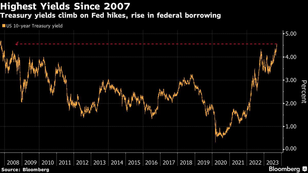 (Bloomberg) — The latest surge in long-term interest rates to the highest levels in 16 years adds to a lengthening list of headwinds threatening to blow the US economy off a soft-landing course.
