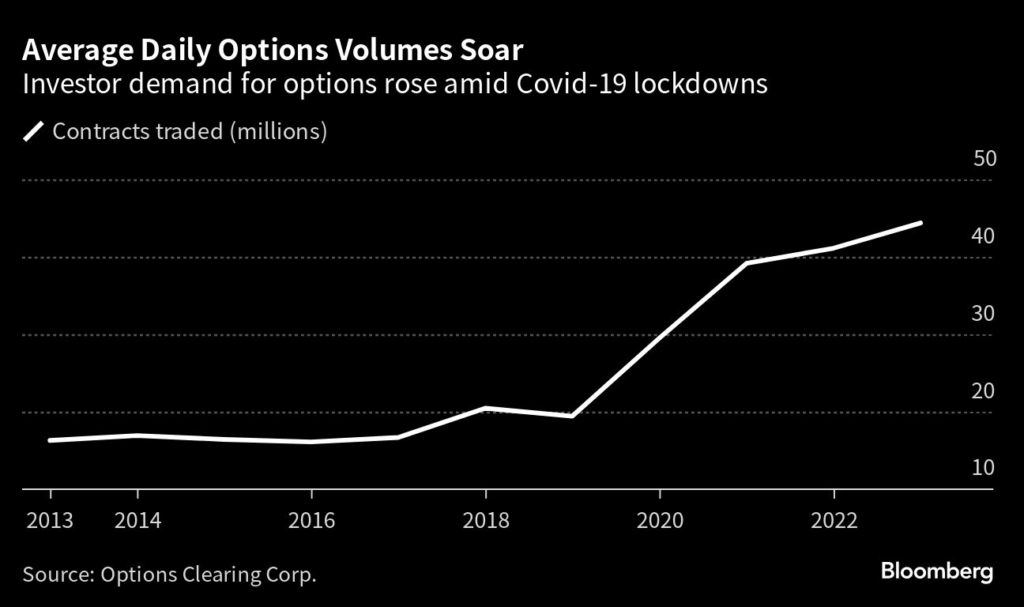 The same lockdown angst that piqued retail traders’ curiosity in digital assets and meme stocks also pumped up options trading, with the derivatives’ volumes now more than double what they were in 2019, according to Options Clearing Corp.