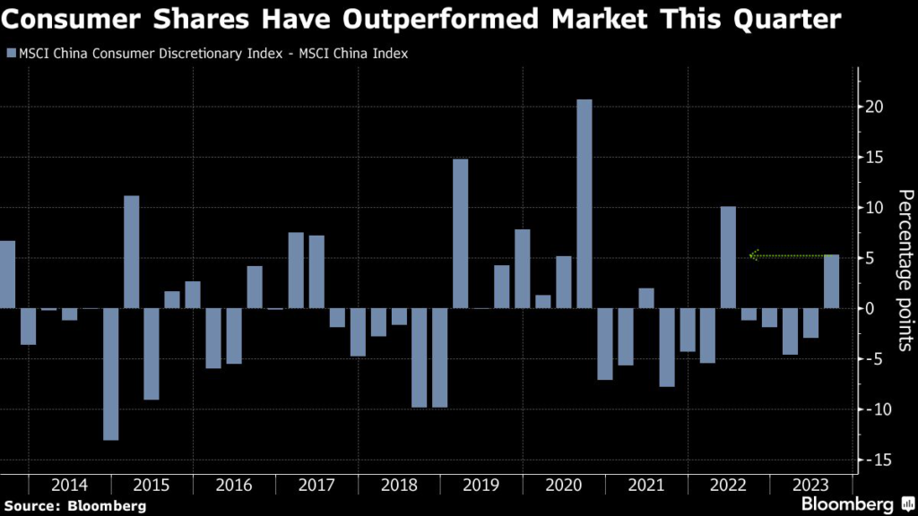 Expectations that the airline, hotel and consumer sectors will benefit from the peak spending season have helped a gauge of consumer discretionary shares chalk up a 1.3% gain this quarter, versus a 4.2% decline in the broader MSCI China Index.
