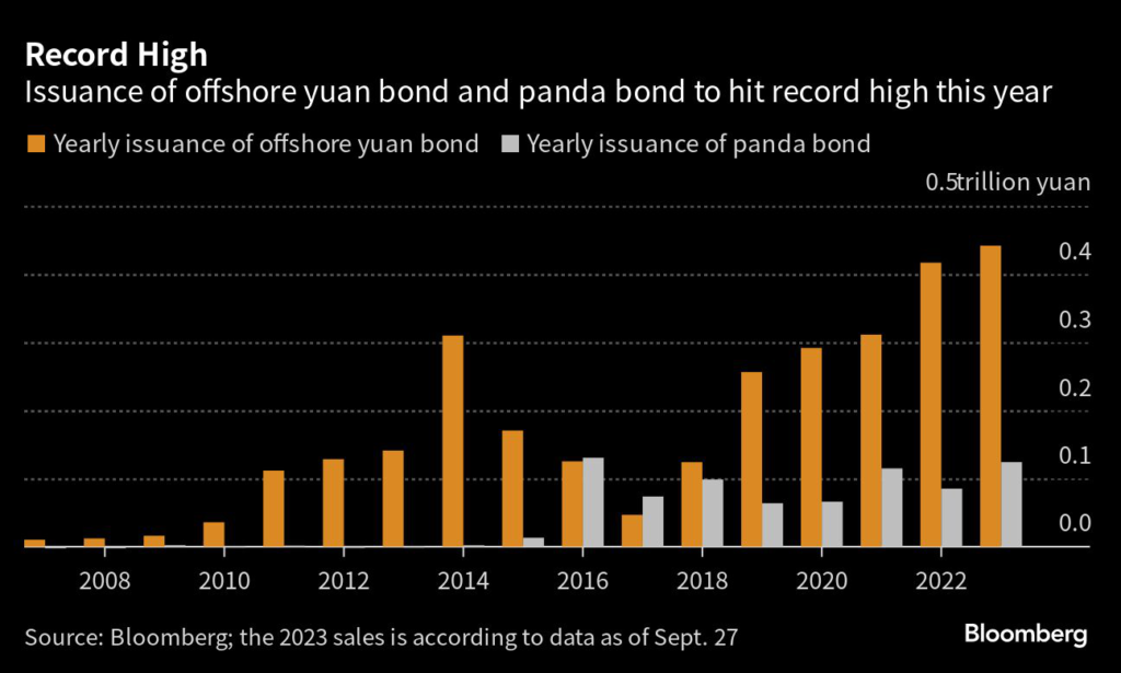 Offshore yuan bond sales so far this year have already hit a yearly record 440 billion yuan, according to data compiled by Bloomberg.