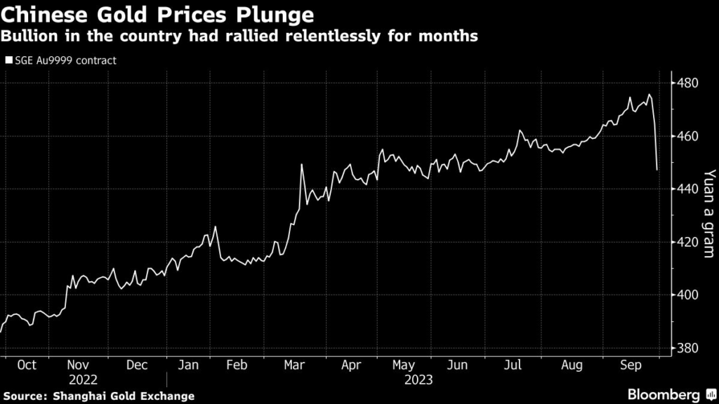 The precious metal fell 3.8% on the Shanghai Gold Exchange, with losses accelerating toward the end of the trading day.