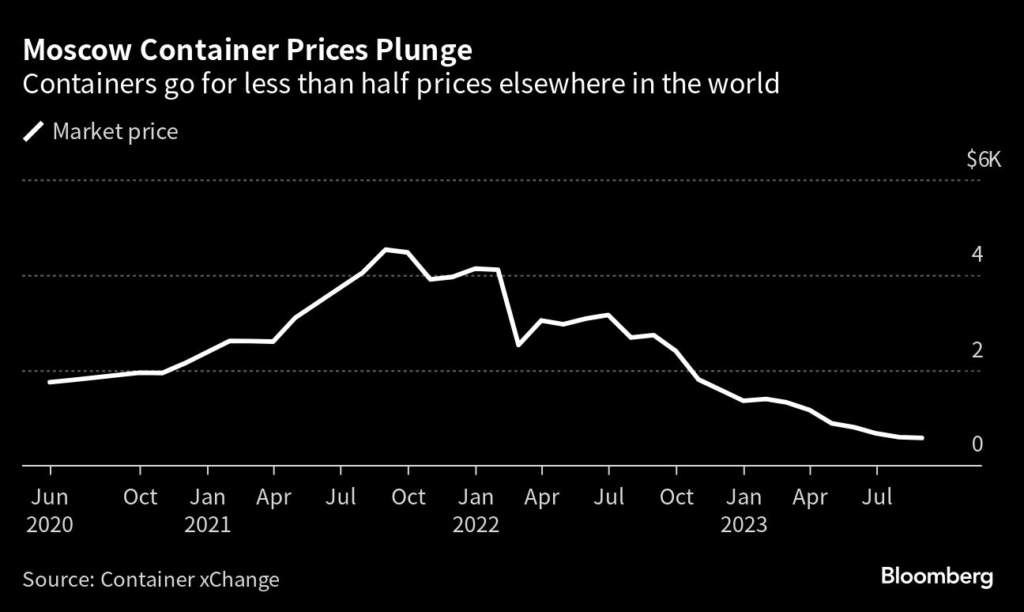 The result: a collapse in the secondary market for containers in Moscow, which are going for less than half the price elsewhere in the world.