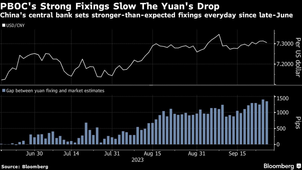 Chinese authorities have ramped up an aggressive defense, with the PBOC setting the daily reference rate for the yuan at the record biases several times this month.