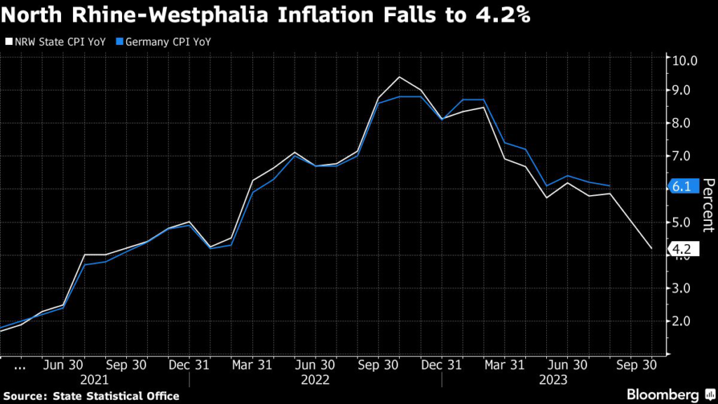 (Bloomberg) — Inflation in the German state of North Rhine-Westphalia fell to 4.2% on the year in September from 5.9% in August, indicating a national figure roughly in line with forecasts.