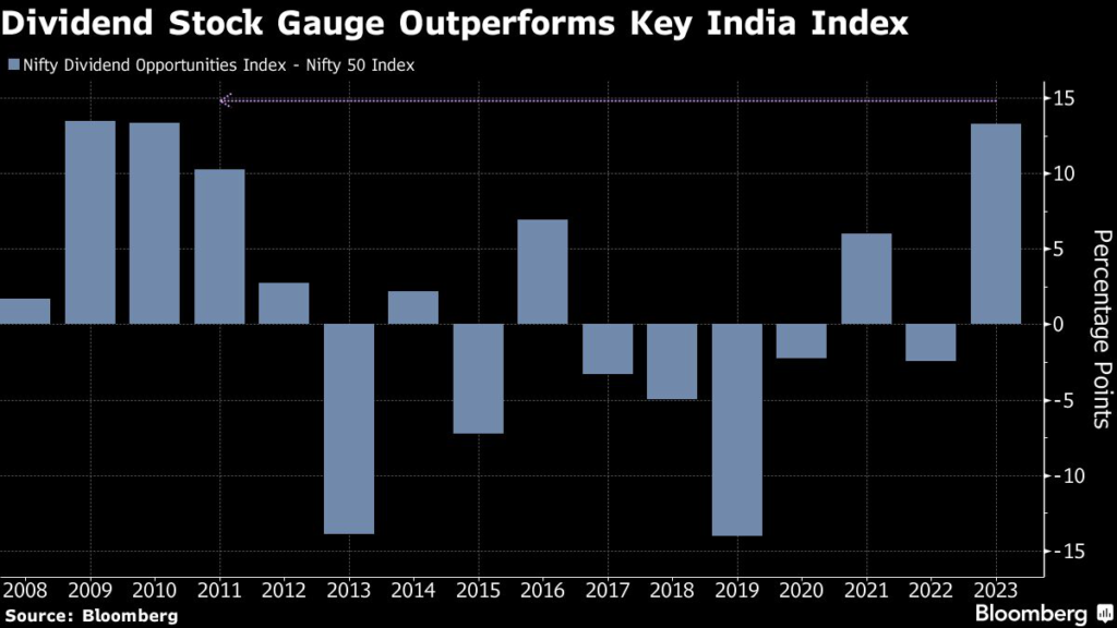 (Bloomberg) — A gauge of top dividend paying firms in India is poised to outperform the country’s key equity benchmark by the most in 13 years as investors seek to hedge against any potential selloff in the market.