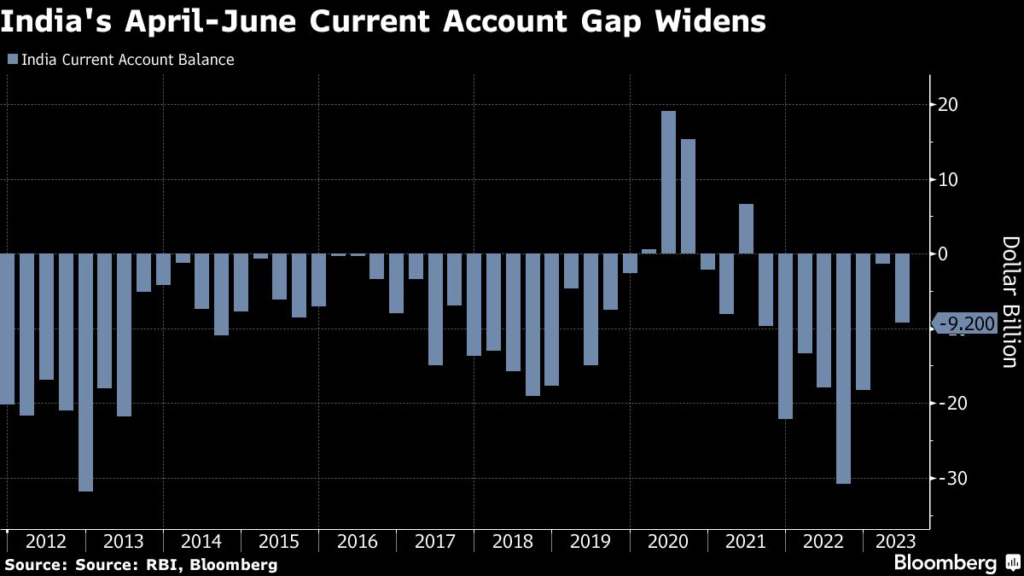 India’s current account deficit widened more than expected in the June quarter as imports outpaced exports amid a decline in inbound remittances.