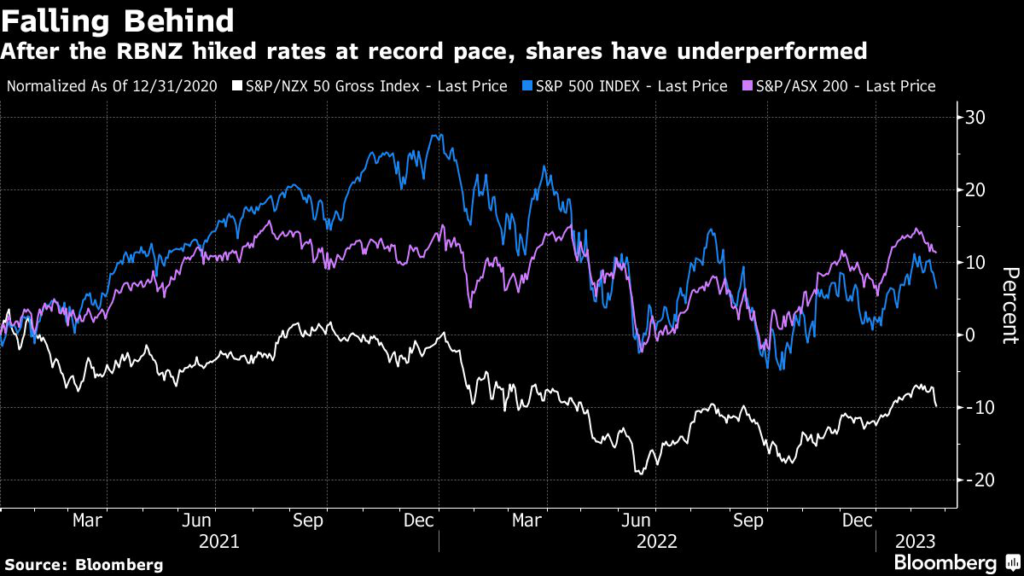 The Reserve Bank of New Zealand’s 525 basis points of tightening since October 2021 has weighed on stocks and the economy.