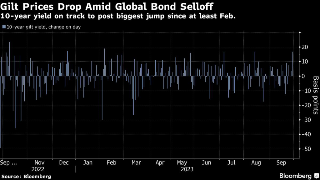 (Bloomberg) — UK government bonds led a global selloff as investors around the world come to terms with the prospect of a protracted period of tight monetary policy.