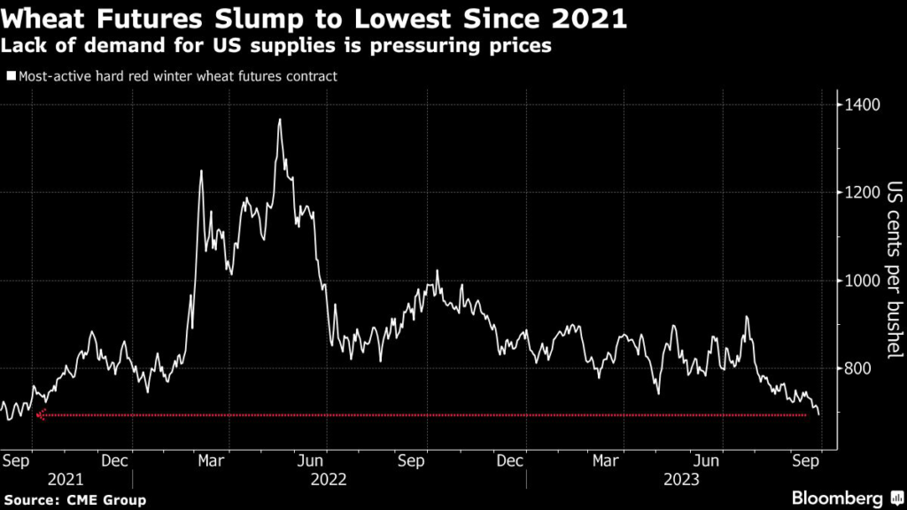 Hard red winter wheat, the top variety grown in the US, held at the lowest level in two years amid plentiful global grain supplies.
