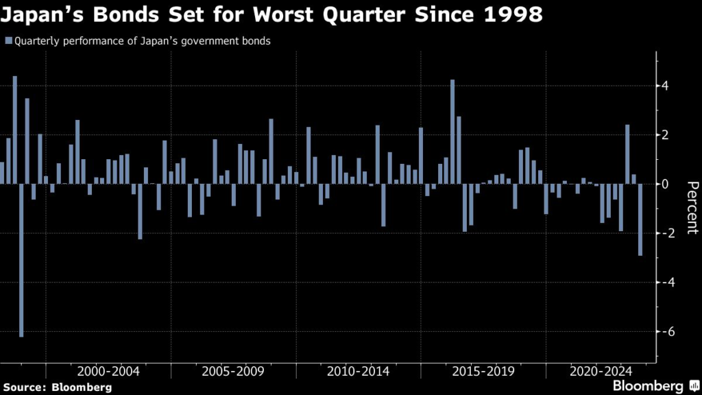 (Bloomberg) — Japan’s government bonds are set for the worst quarterly selloff in more than two decades as the central bank loosens its grip on the market.