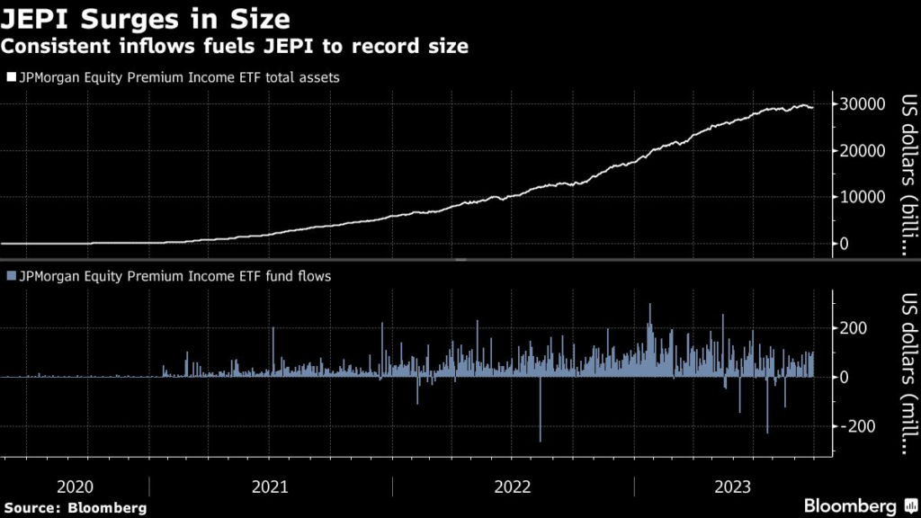 JEPI’s total assets hit a high-water mark of $29.8 billion earlier this month — larger than Cathie Wood’s Ark Innovation ETF (ARKK) peak of $28.2 billion reached in the halcyon days of February 2021.
