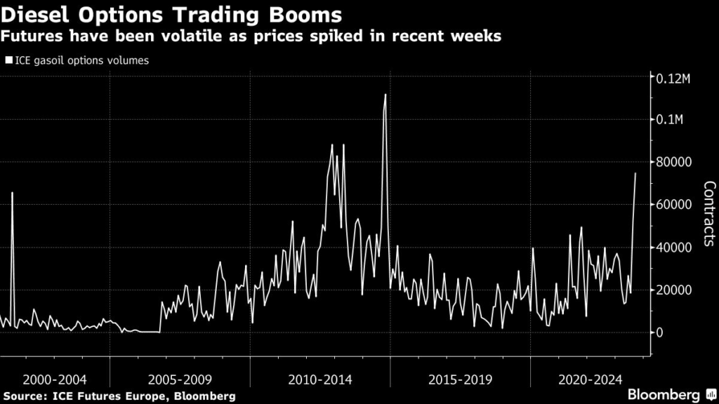Trading of options contracts on ICE gasoil, Europe’s benchmark diesel contract, climbed to the highest level since 2014 in September, according to exchange data.
