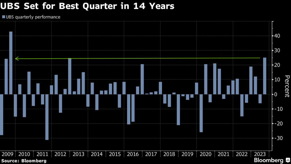 (Bloomberg) — Just six months after mounting an emergency rescue of stricken rival Credit Suisse, UBS Group AG is poised for its best quarterly share-price gain in 14 years.
