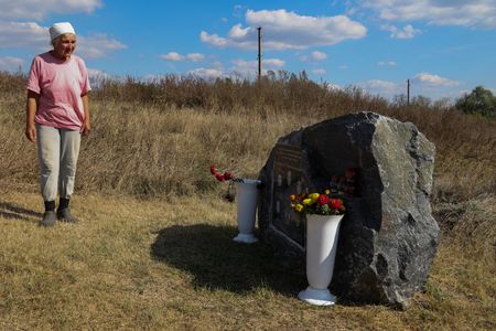 Nowadays, she keeps busy fixing the damage to her yard and tending to a monument to Ukrainian soldiers who died defending the village.