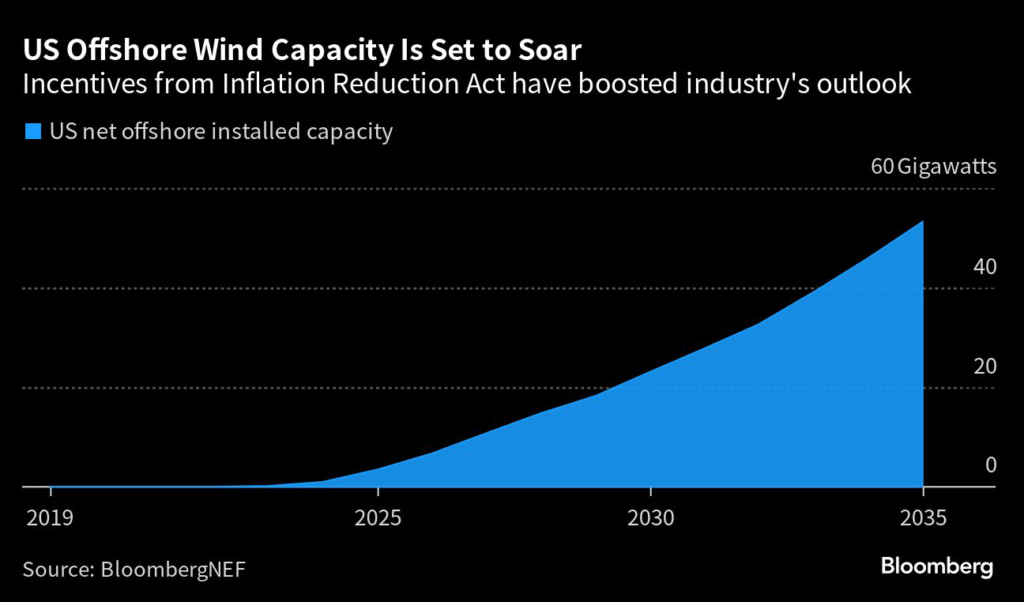 Thanks to incentives provided by President Joe Biden’s landmark climate law — the Inflation Reduction Act — cumulative offshore wind installed capacity is set to soar to more than 53 gigawatts by 2035, according to BloombergNEF.