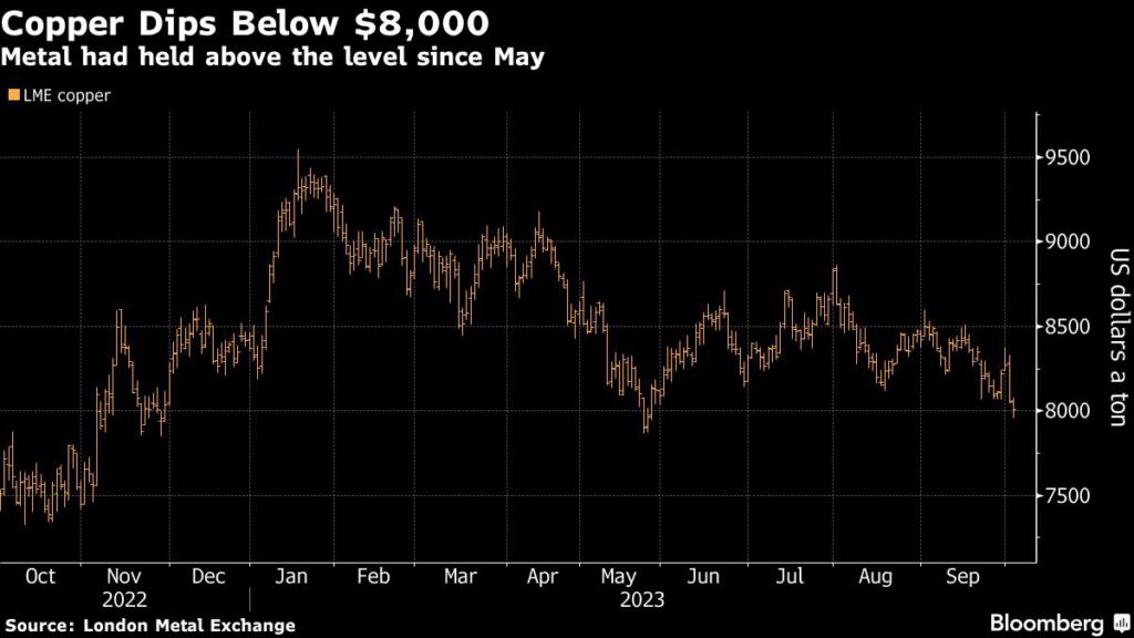 The industrial metal briefly traded below $8,000 a ton on the London Metal Exchange for the first time since late May as worries over higher-for-longer US interest rates spurred risk-off sentiment in global financial markets.