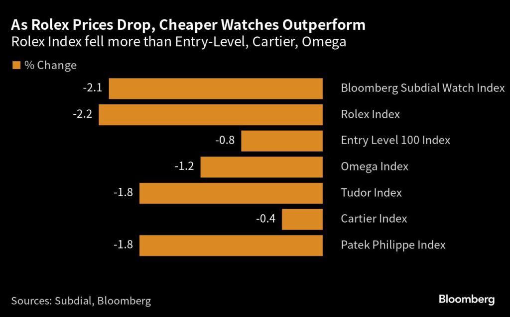 The Bloomberg Subdial Watch Index, which includes a group of the 50 most traded watches by value from Rolex, Patek Philippe and Audemars Piguet, has dropped about 5% in six months while the Entry-Level 100 index has fallen by just 0.7% over the same period.