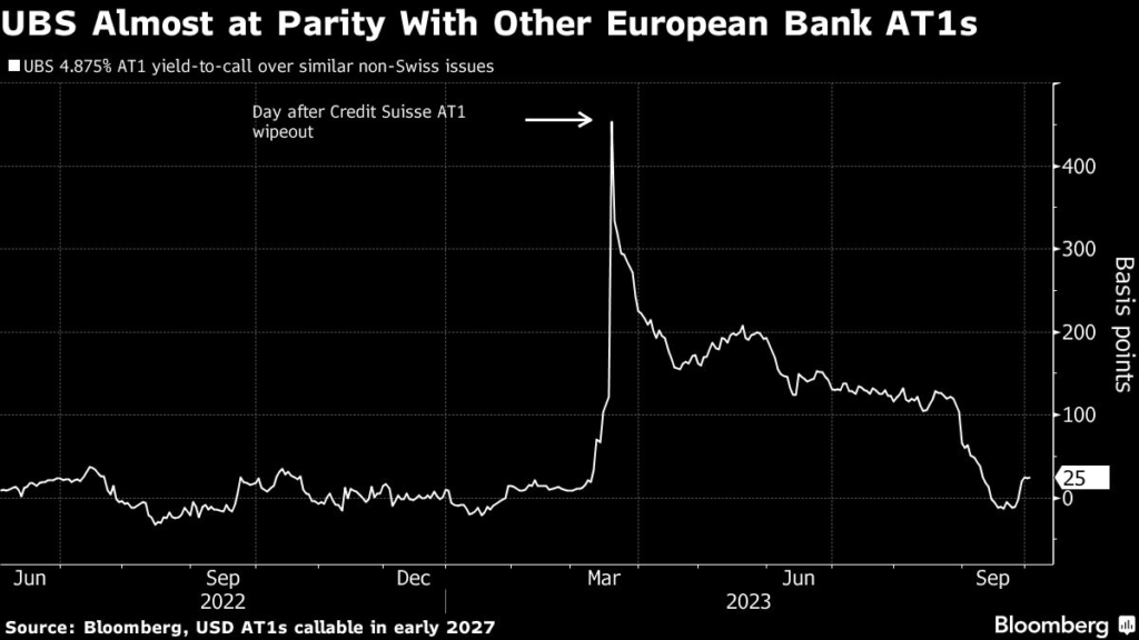 Now, the extra yield on UBS’s AT1 versus non-Swiss lenders stands at just 25 basis points, according to data compiled by Bloomberg.