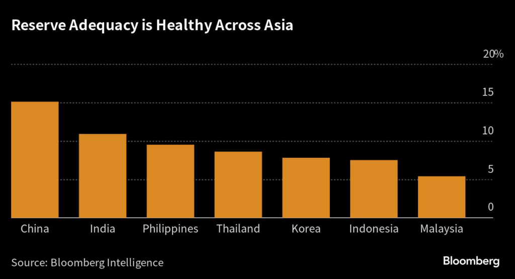The reserve position in emerging Asia excluding China, on the basis of import cover, remains the highest in Taiwan, followed by India, Philippines and Thailand, said Shreya Sodhani, Singapore-based economist at Barclays Plc.