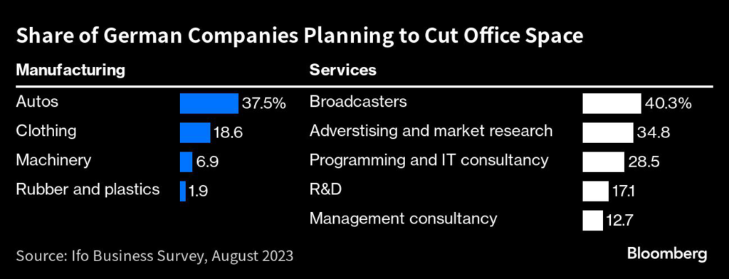 (Bloomberg) — Almost one in 10 German companies plans to reduce office space in response to remote working habits, adding pressure to a commercial real estate market already creaking from higher interest rates and construction costs.