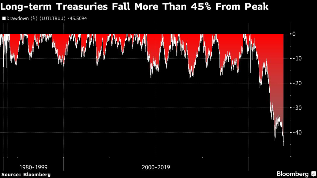 That’s just shy of the 49% plunge in US stocks in the aftermath of the dot-com bust at the turn of the century. The rout in 30-year bonds has been even worse, tumbling 53%, nearing the 57% slump in equities during the depths of the financial crisis.