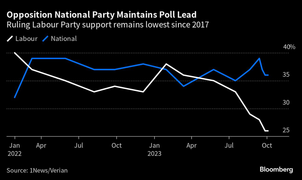 (Bloomberg) — New Zealand’s main opposition National Party is in prime position to win this month’s election but it will need the support of two smaller parties to govern, according to the latest opinion poll.
