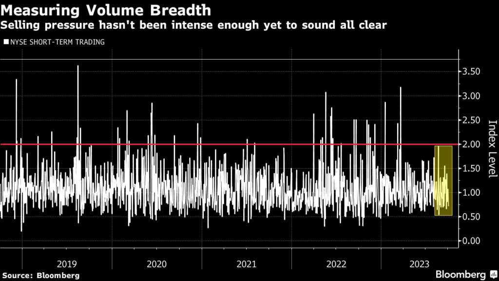 Readings above 2.0 in the gauge are a sign that investors are dumping equities, while those below 0.5 suggest there’s more demand for stocks, according to Mark Newton, head of technical strategy at Fundstrat Global Advisors.