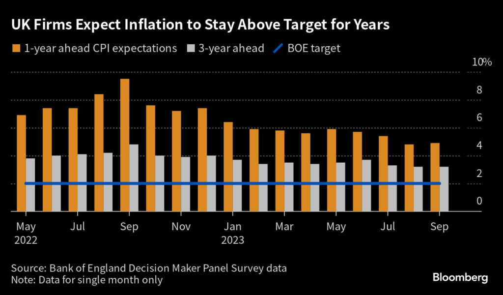 (Bloomberg) — UK price pressures showed little sign of easing last month, according to a Bank of England survey of employers that showed inflation expectations and planned pay deals both edging up.