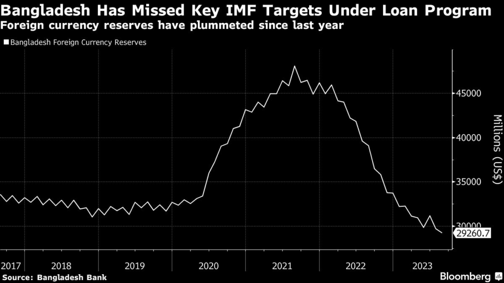 Bangladesh has missed two key targets — on foreign currency reserves and tax collection — under the loan program, meaning it will need to seek waivers in order to receive the second instalment of funds from the IMF, according to analysts.