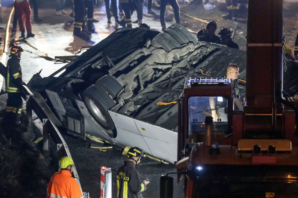 A tourist bus with passengers including a group of visitors from Ukraine and several other countries caught fire after falling from the overpass near the Mestre railway station on the mainland across from Venice late Tuesday.