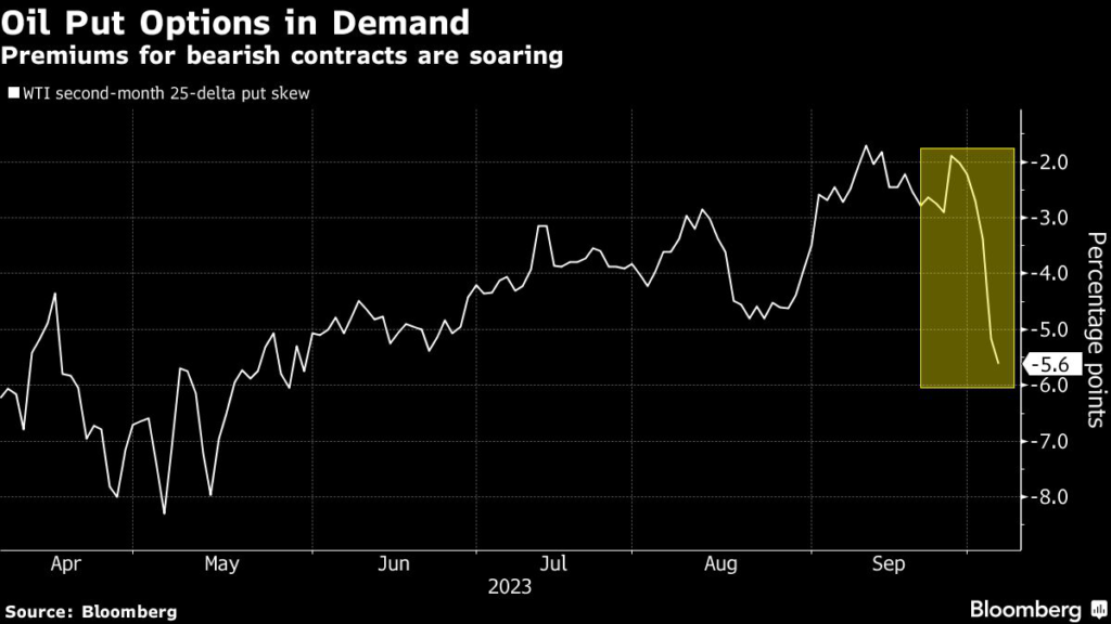 Volatility also spiraled higher. A gauge of implied volatility for WTI, which effectively reflects how expensive options are, jumped by the most since May.