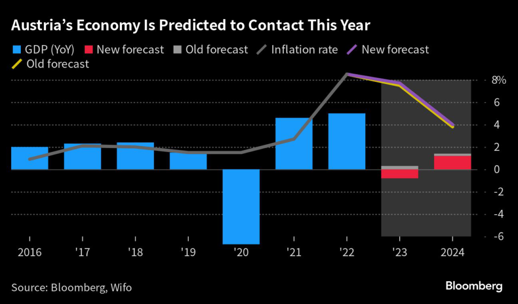 (Bloomberg) — Austria’s economy will contract this year due to the fallout from the European Central Bank’s interest-rate increases, according to the country’s Wifo research institute.