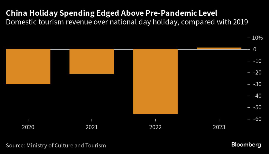 (Bloomberg) — Tourism revenue from China’s “Golden Week” holiday surged year-on-year but edged only slightly above its pre-Covid level, suggesting relatively muted consumer sentiment continues to weigh on the country’s economic growth.