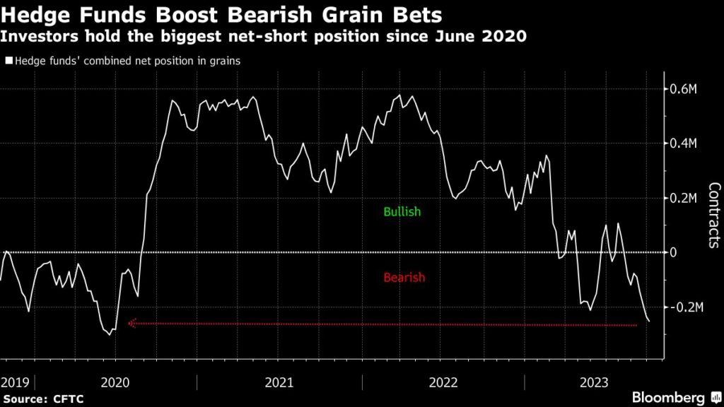 (Bloomberg) — Hedge funds increased their bearish wagers on grain futures to the most since the early months of the pandemic as ample supplies and demand woes weigh on prices.