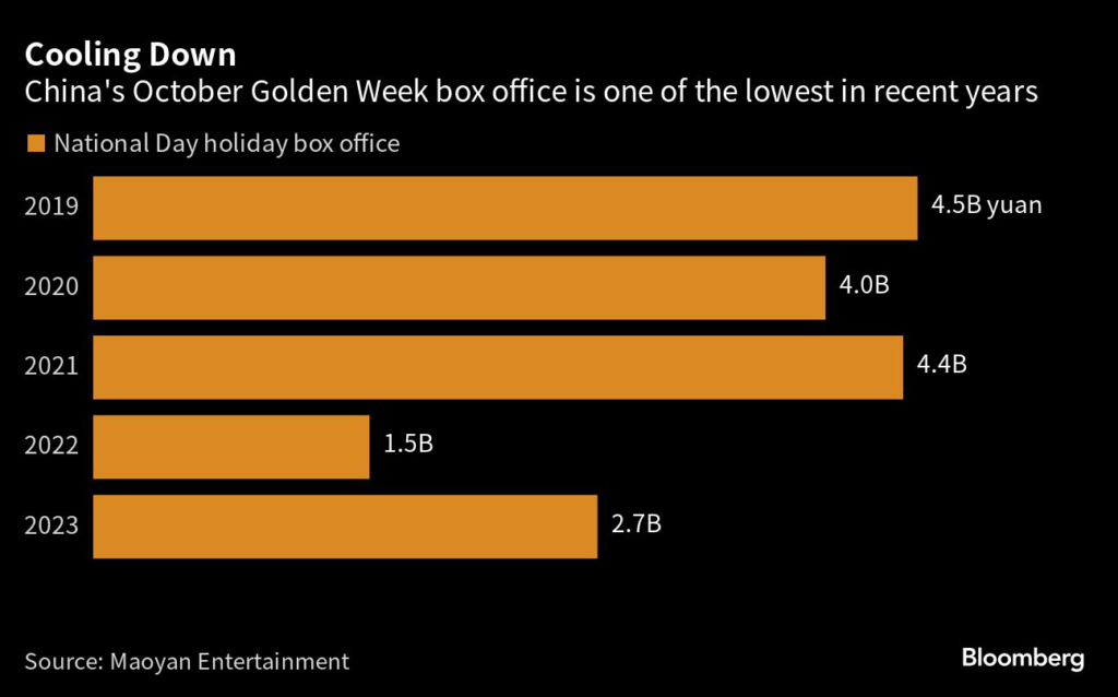 (Bloomberg) — China’s film market unexpectedly cooled during what’s typically one of it’s most important seasons, as a lack of blockbuster releases and booming travel demand kept people away from cinemas.
