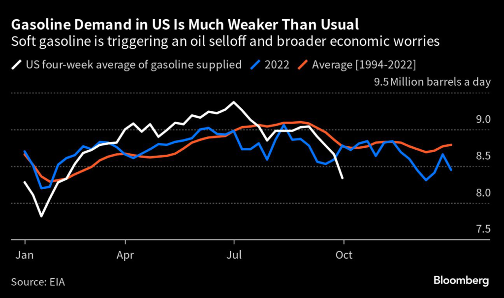 Part of the weakness has to do with expensive pump prices, which followed oil’s surge to record seasonal highs, a move that analysts at JPMorgan Chase & Co. say has led to demand destruction.