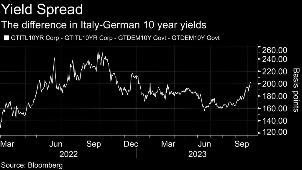 Investors are offloading Italian debt as nerves fray over Prime Minister Giorgia Meloni’s spending plans along with sluggish growth.