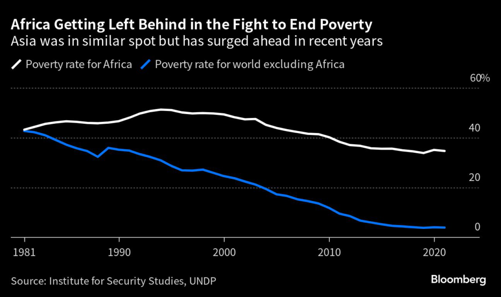 Africa’s poverty headcount ratio, or the share of the population living on less than $2.15 a day, has declined from around 56% at the turn of the century to 35%.