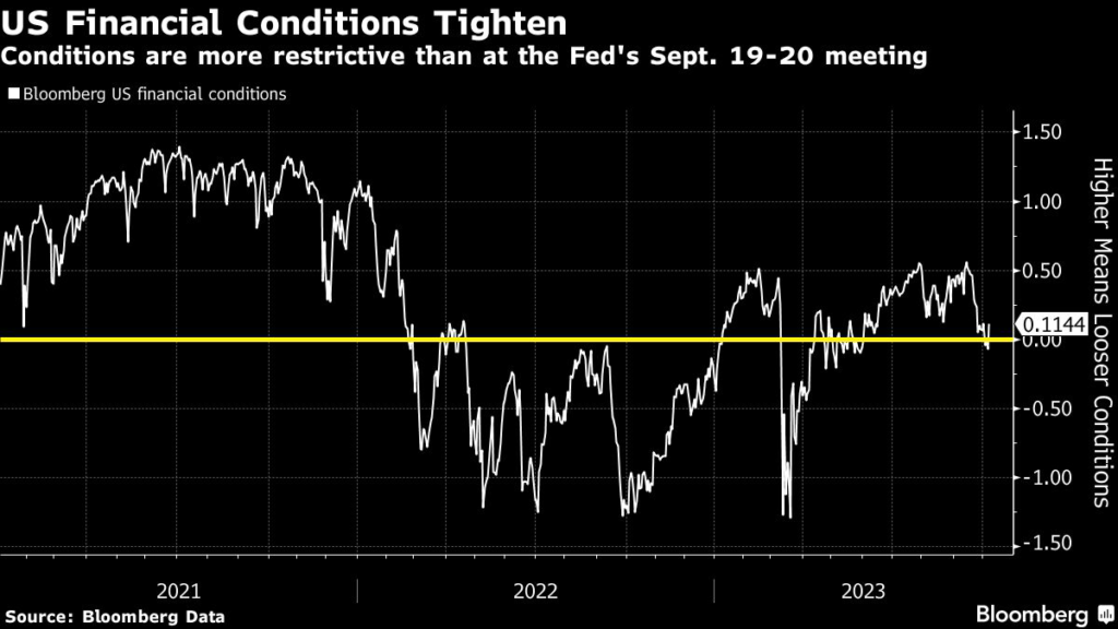 Fed officials including San Francisco’s Mary Daly and Lorie Logan of Dallas noted the recent tightening of financial conditions may substitute for additional rate hikes.
