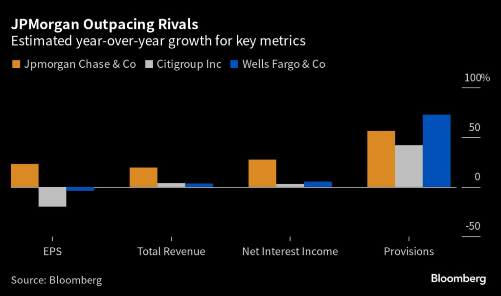 JPMorgan Chase & Co. is expected to have outperformed Citigroup Inc. and Wells Fargo & Co. in profitability when the three banks report quarterly earnings this week, though all lenders face challenges from a slow economy and high interest rates.