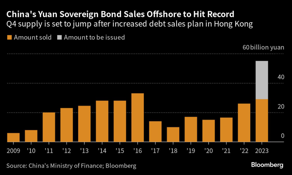 The country’s Ministry of Finance will issue 26 billion yuan ($3.6 billion) of such debt in Hong Kong in the current quarter, starting with a first batch of 16 billion yuan on Oct.