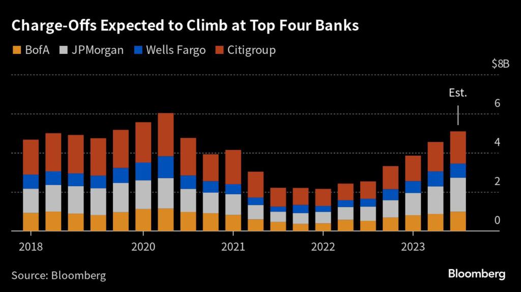(Bloomberg) — The biggest US banks are poised to write off more bad loans than they have since the early days of the pandemic as higher-for-longer interest rates and a potential economic downturn are putting borrowers in a bind.