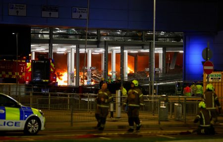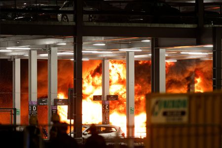 LONDON (Reuters) -London’s Luton Airport resumed flights on Wednesday after they were suspended for nearly 18 hours due to a fire involving a diesel car that set off a major blaze, partially destroying a multi-storey car park.