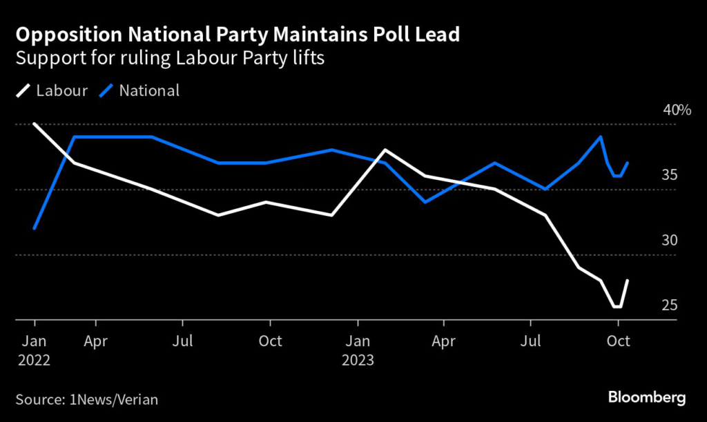 (Bloomberg) — New Zealand’s main opposition National Party retained the prime position to win Saturday’s election, though it would require the support of smaller parties to govern, according to two opinion polls published Wednesday in Wellington.
